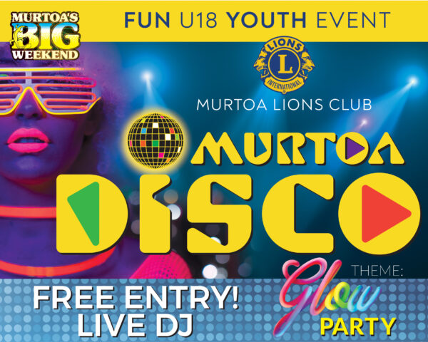 Under 18s are invited to a free night of entertainment of live DJ entertainment, proudly supported by Murtoa Lions Club. Theme: GLOW Party… hit the dancefloor packed with UV lights and glow!